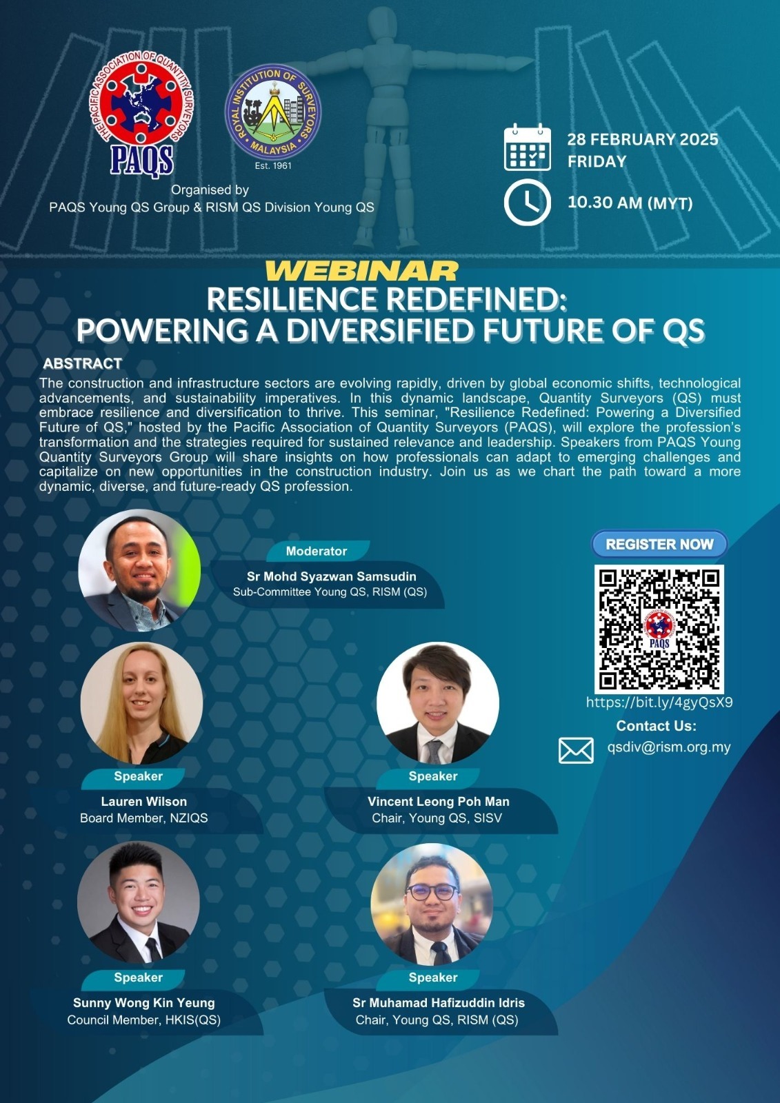 PAQS Young QS group and RISM QS Division Young QS will be organizing the Webinar - Resilience Redefined: Powering a Diversified Future of QS on 28 February 2025, enclosed herewith the flyer and the abstract of the event for your reference.
