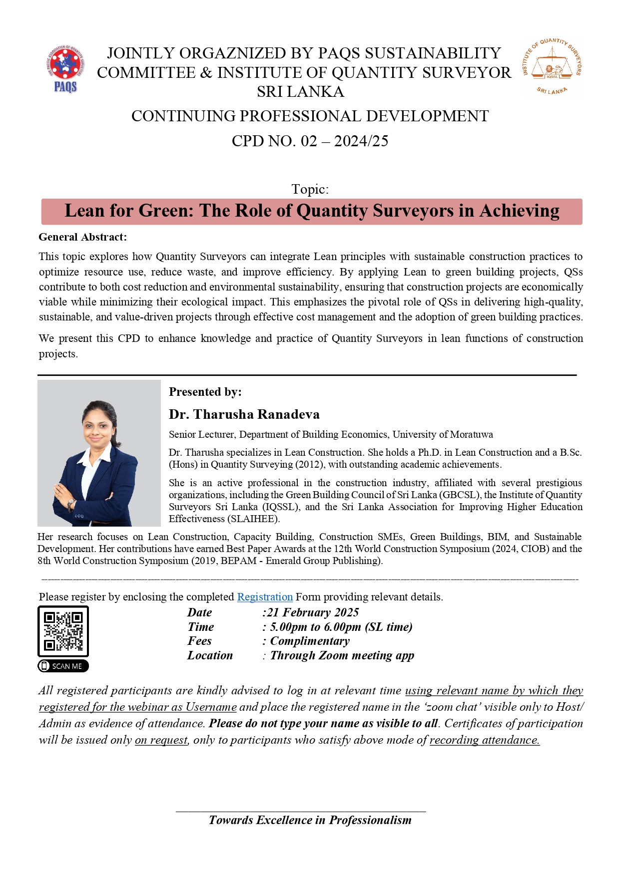 Presented by: Dr. Tharusha Ranadeva, Senior Lecturer, Department of Building Economics, University of Moratuwa, specializing in Lean Construction. Dr. Tharusha brings a wealth of knowledge and experience in Lean Construction, Green Buildings, and Sustainable Development.