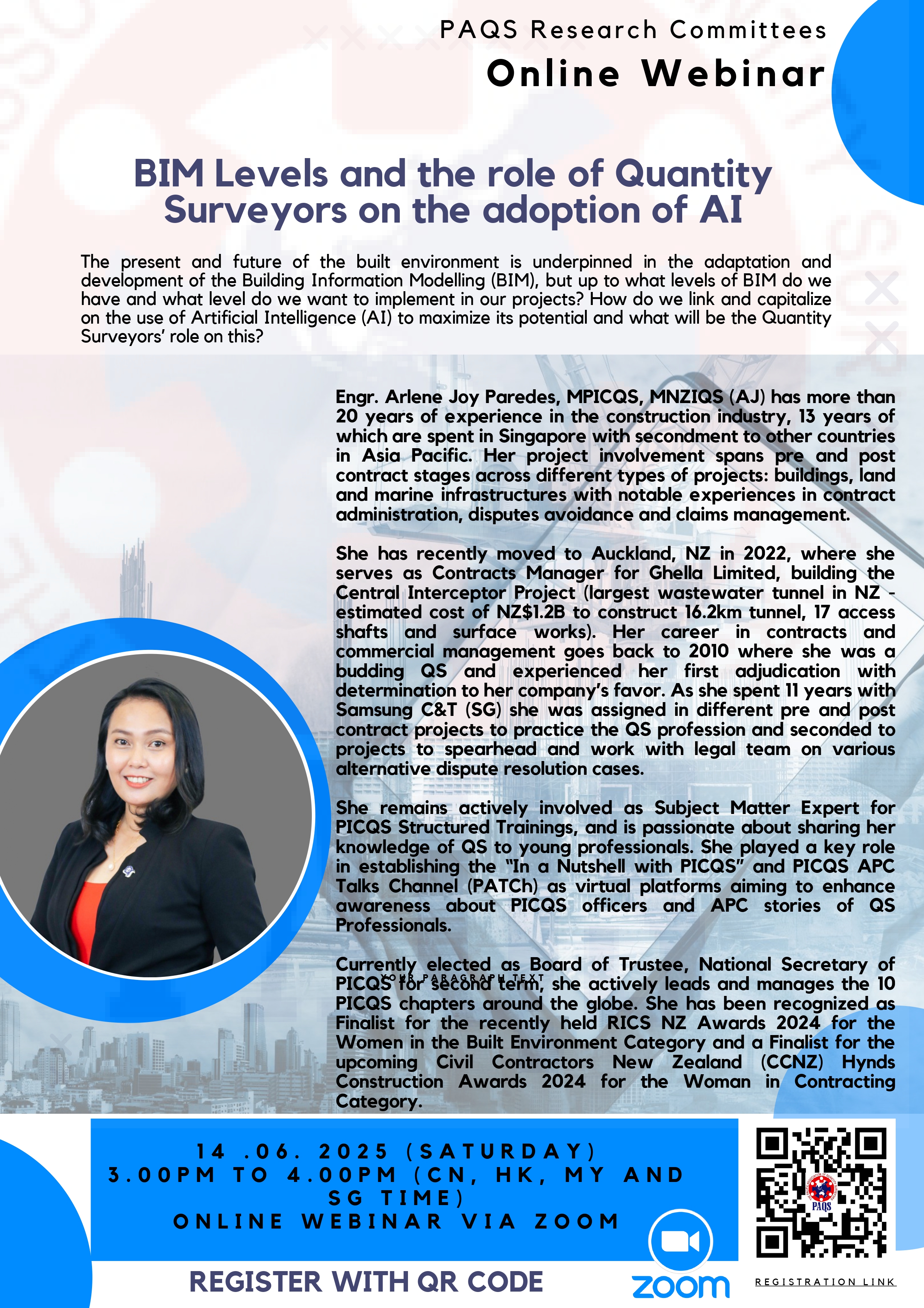 Join us for an insightful PAQS Research Committees Online Webinar on "BIM Levels and the role of Quantity Surveyors on the adoption of AI" on June 14, 2025 (Saturday), from 3:00 PM - 4:00 PM (CN, HK, MY, SG time).
